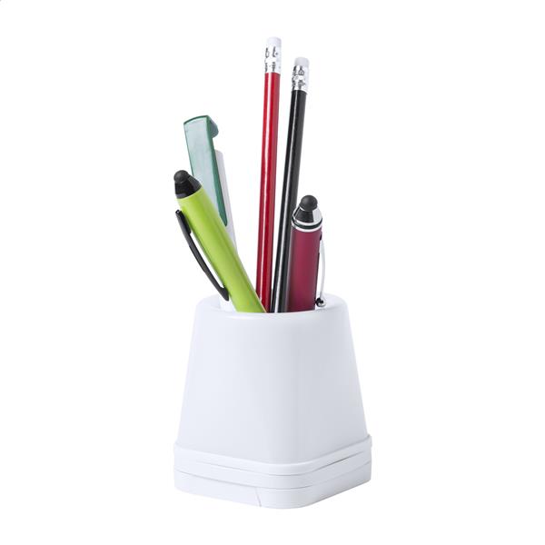 Plastikowy stojak na długopisy z 4 portami USB, uchwytem na telefon i 4 lampkami LED. USB 2.0.