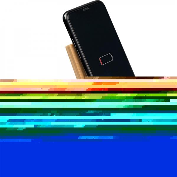 Bambusowa podstawka pod telefon z dziurką na kabel, umożliwiającą podłączenie ładowarki.