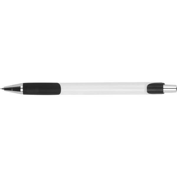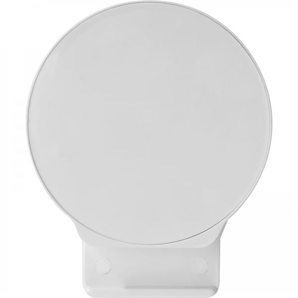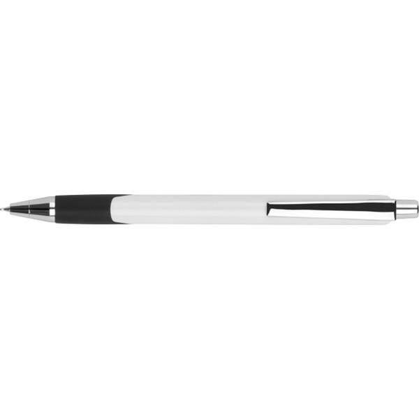 Plastikowy stojak na telefon z antypoślizgową podstawą i metalowym długopisem piszącym na niebiesko.