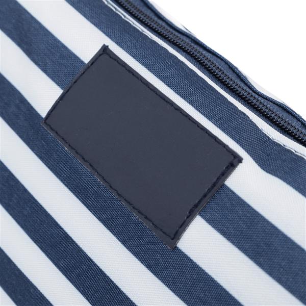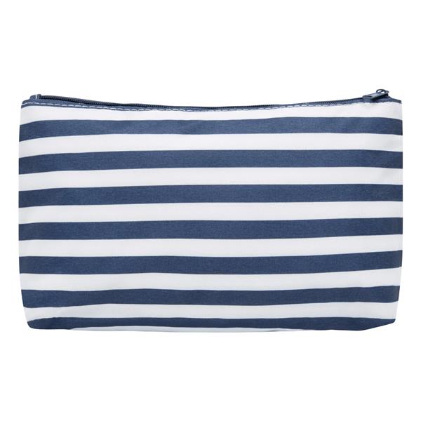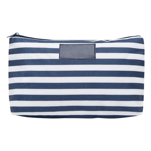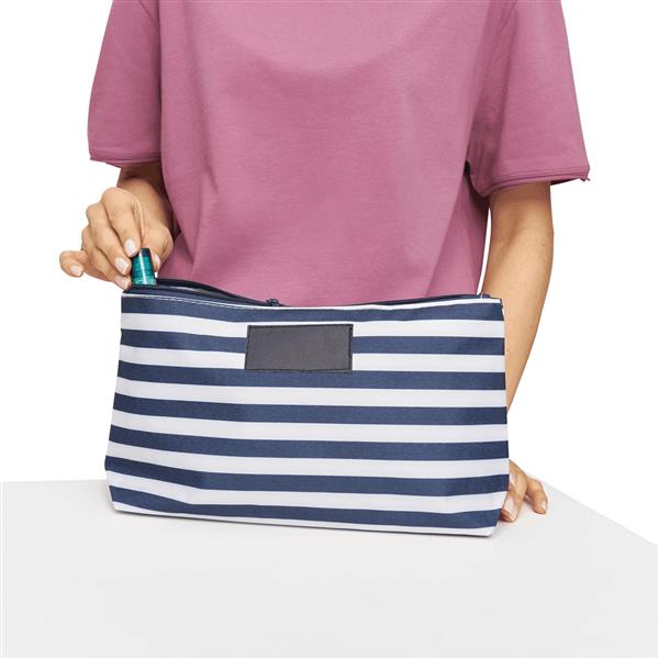 Kosmetyczka STRIPY, komora główna na zamek, wewnątrz mała kieszonka na zamek, na zewnątrz marynistyczne paski, z doskonałą do oznakowania, skóropodobną naszywką z przodu – idealna na kosmetyki i akcesoria.