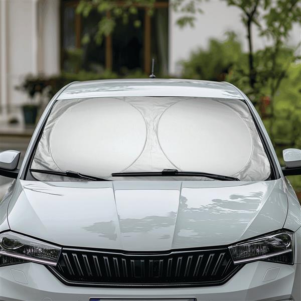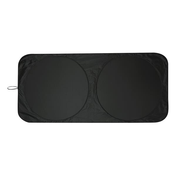 Samochodowa osłona przeciwsłoneczna na szybę SUN SHIELD. Ma srebrną powłokę z jednej strony oraz czarną z drugiej. Wygodny gumowy pasek umożliwia zabezpieczenie osłony po złożeniu. W zestawie znajduje się także torba do przechowywania.