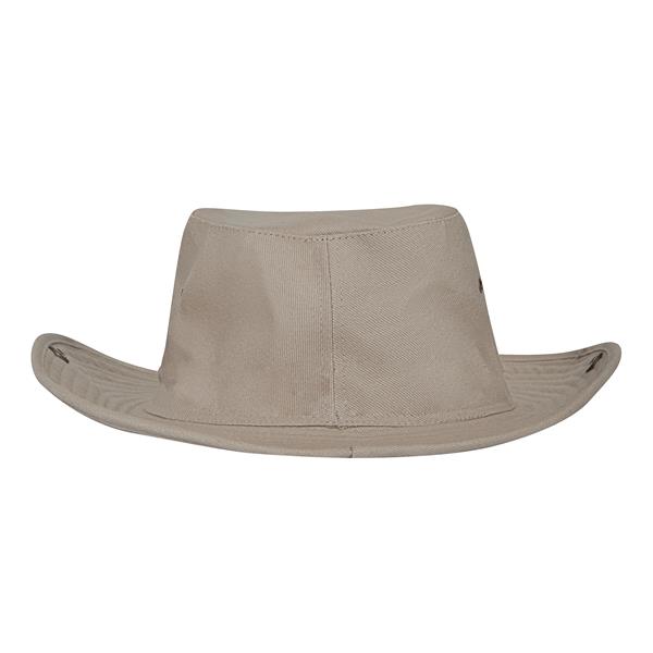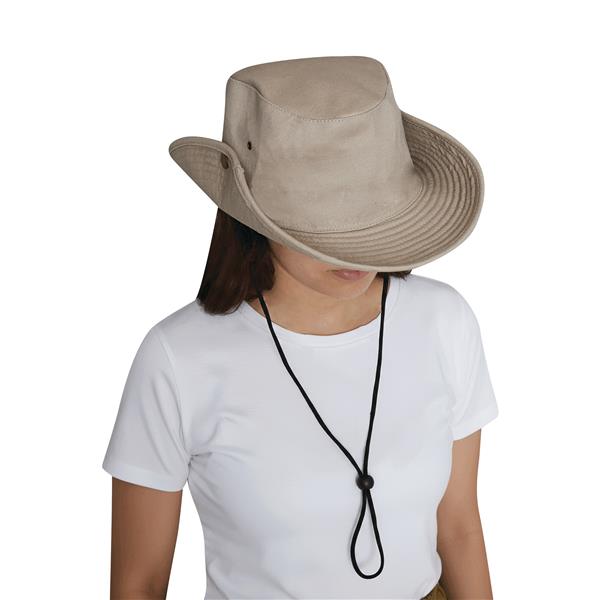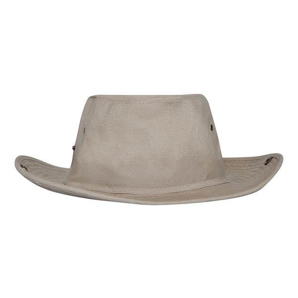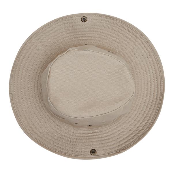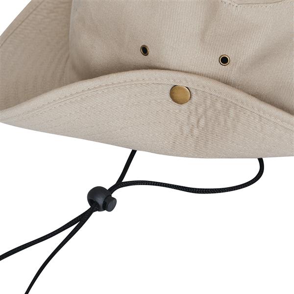 Kapelusz safari SUNDALE. Rondo kapelusza można złożyć i zapiąć na boku za pomocą zatrzasków. Ma 4 metalowe oczka wentylacyjne i pasek pod brodą z plastikową blokadą do regulacji rozmiaru.