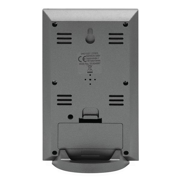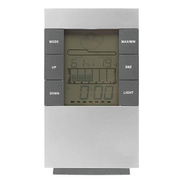 Stacja pogodowa SUNNY TIMES z ekranem LCD, budzikiem, datownikiem, termometrem i rozkładanym stojaczkiem.