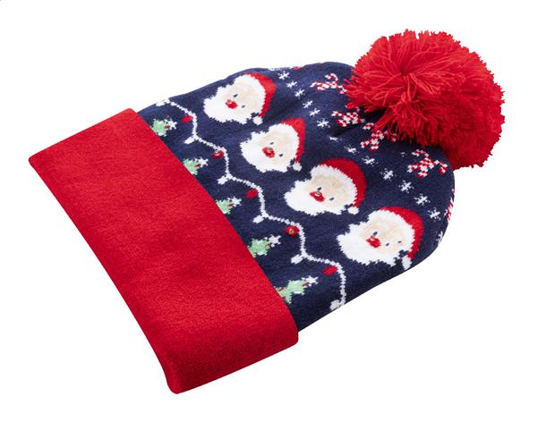 Dzianinowa czapka świąteczna z akrylu z 6 diodami LED (3 tryby świecenia), mankietem i pomponem. Zasilana baterią guzikową.