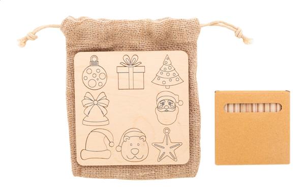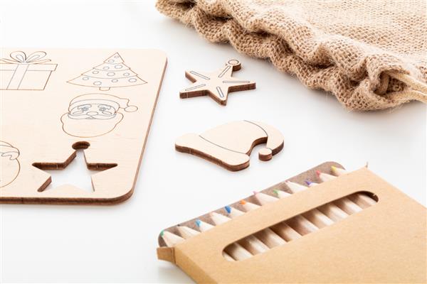 Świąteczna gra polegająca na dopasowywaniu kształtów, wykonana ze sklejki brzozowej, którą można kolorować, z jutowym woreczkiem. Zawiera tematyczne wycięte figurki (8 szt.) i drewniane kredki (12 szt.) w papierowym pudełku.