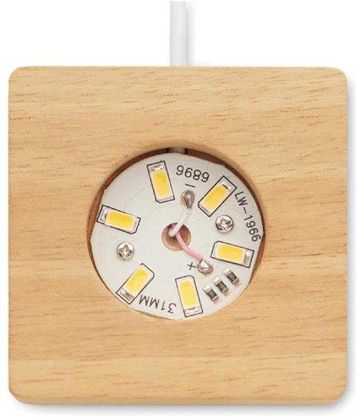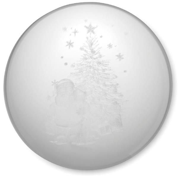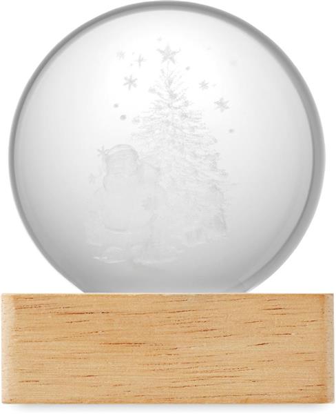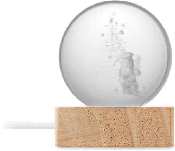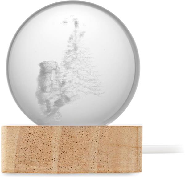 Świąteczna ozdoba w Szklana kuli ze światłem LED (100 lumenów) na podstawie z drewna kauczukowego. W zestawie kabel USB do ładowania (90 cm).