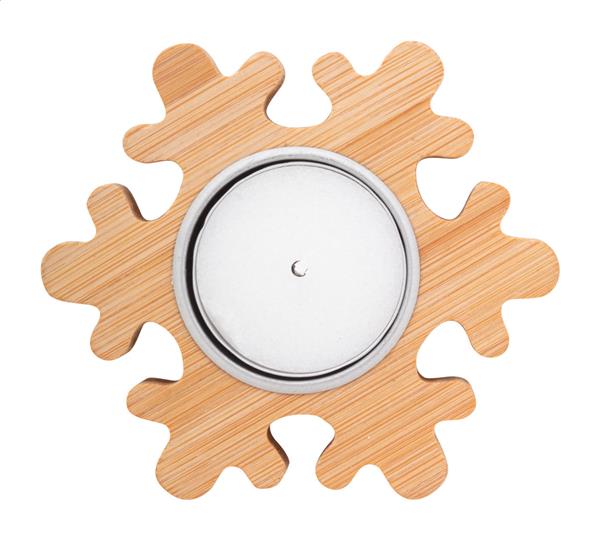 Bambusowy świecznik bożonarodzeniowy ze świeczką typu tealight na bazie wosku roślinnego o zapachu wanilii. Czas palenia: 4 godziny. W pudełku z papieru kraft.
