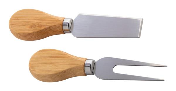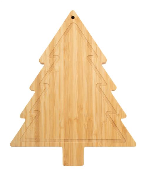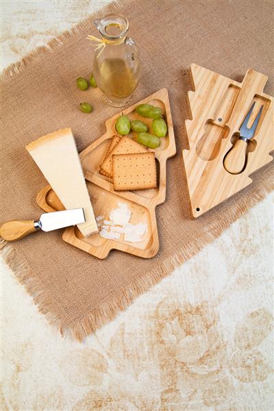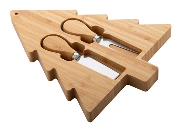 Zestaw bambusowy do sera w świątecznym stylu, z deską do krojenia w kształcie choinki i 2 nożami do sera ze stali nierdzewnej. W papierowym pudełku.