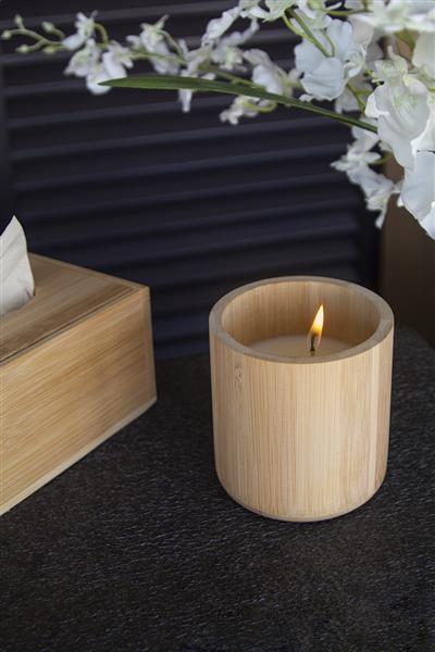 Świeca z wosku roślinnego o zapachu wanilii w bambusowym pojemniku. Z 160 gramami wosku. W kartoniku.