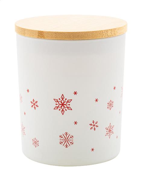 Zapachowa świeca woskowa na bazie roślin w matowym szklanym pojemniku z dekoracją w kształcie płatka śniegu i bambusową pokrywką. Zawiera 120 gramów wosku. W pudełku z papieru kraft.