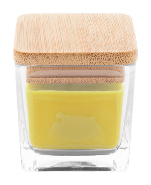 Zapachowa świeca woskowa pochodzenia roślinnego w szklanym pojemniku z bambusową pokrywką. Z 50 gramami wosku. Czas palenia: 8 godzin. W pudełku z papieru kraft.