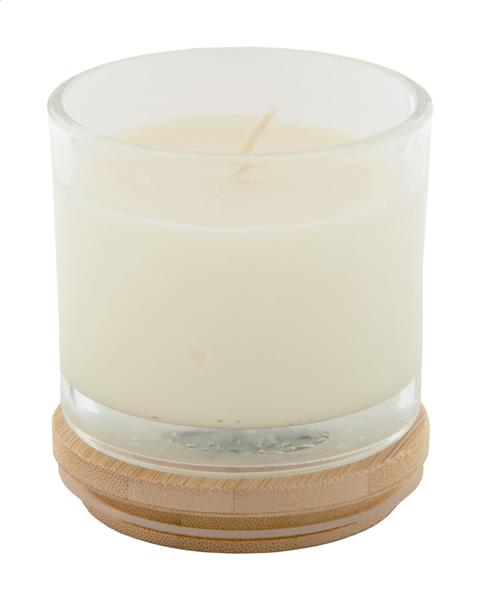 Świeca woskowa o zapachu wanilii na bazie roślin w szklanym pojemniku z bambusową pokrywką. Z 95 gramami wosku. W kartoniku.