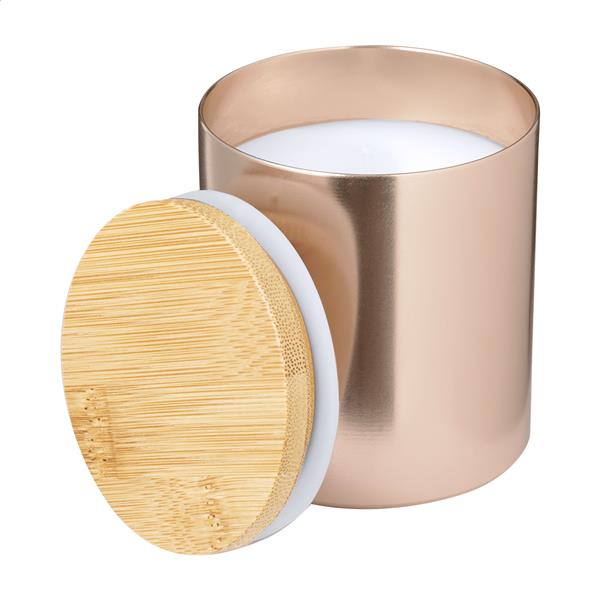 Świeca o zapachu wanilii w aluminiowym pojemniku z bambusową pokrywką.