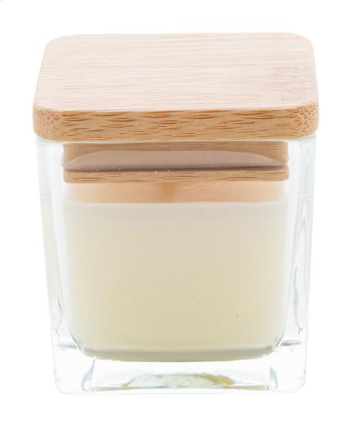 Zapachowa świeca woskowa pochodzenia roślinnego w szklanym pojemniku z bambusową pokrywką. Z 50 gramami wosku. Czas palenia: 8 godzin. W pudełku z papieru kraft.