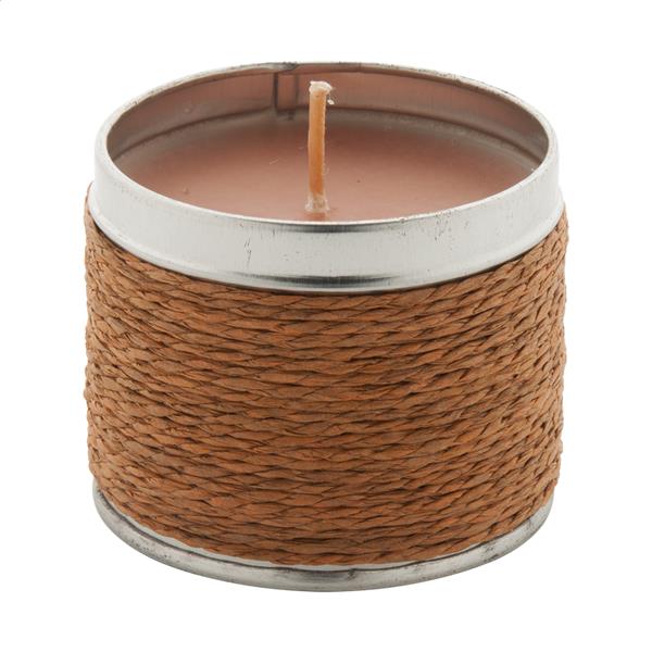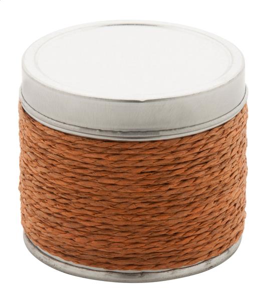 Świeca w metalowym pudełku oplecionym sznurkiem.
