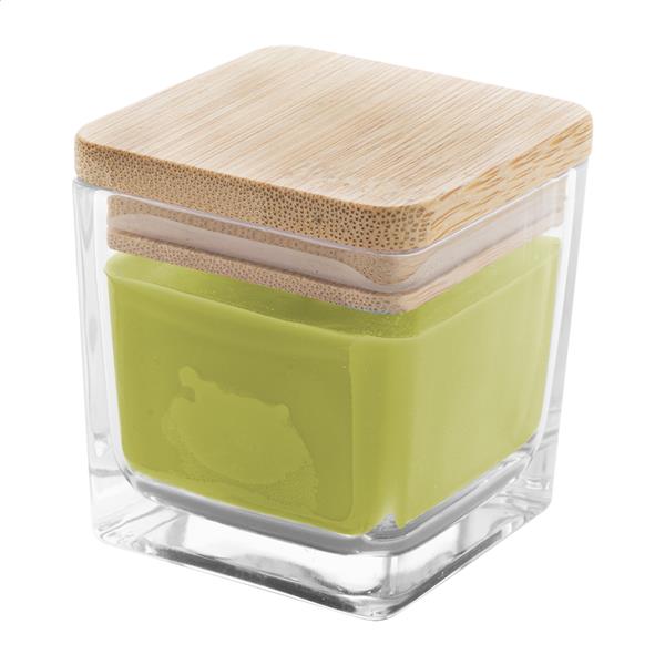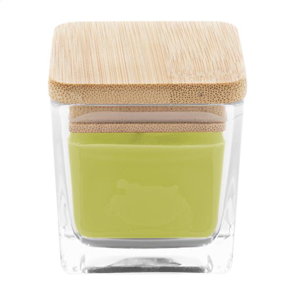Zapachowa świeca woskowa pochodzenia roślinnego w szklanym pojemniku z bambusową pokrywką. Z 50 gramami wosku. Czas palenia: 8 godzin. W pudełku z papieru kraft.