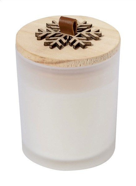 Woskowa świeca zapachowa (waniliowa) w szklanym słoiku, z drewnianą pokrywką ozdobioną, wzorem płatka śniegu.