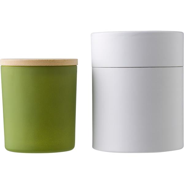 Świeczka zapachowa w szklanym słoiczku (02-wanilia, 05-cynamon, 03-olejek sandałowy, 06-jaśmin) z bambusowym wieczkiem, zawiera głównie wosk roślinny (wosk carbauba), czas palenia około 46h