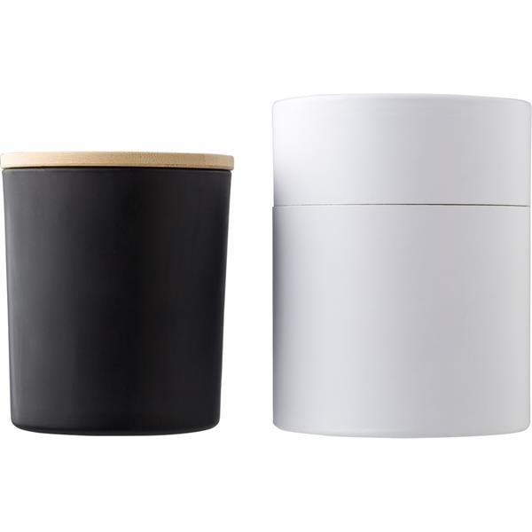 Świeczka zapachowa w szklanym słoiczku (02-wanilia, 05-cynamon, 03-olejek sandałowy, 06-jaśmin) z bambusowym wieczkiem, zawiera głównie wosk roślinny (wosk carbauba), czas palenia około 20h