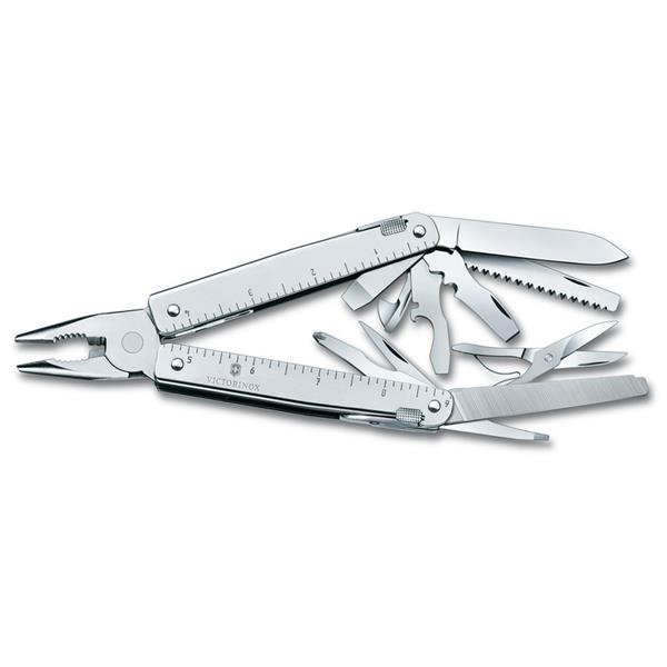 Swiss Tool Plus to propozycja dla tych, którzy szukają czegoś więcej niż scyzoryka. To cały zestaw narzędzi umieszczonych wjednej, eleganckiej obudowie oprzemyślanej konstrukcji. Do narzędzia dołączone jest skórzane etui. Specyfikacja: 1. szpikulec 2. kombinerki 3. Srubokręt 2 mm 4. Srubokręt 3 mm 5. przecinak do drutu 6. śrubokręt 5 mm 7. otwieracz do kapsli 8. śrubokręt 7,5 mm 9. ostrze 10. nożyczki 11. pilnik metalowy 12. piłka do metalu 13. piłka do drewna 14. śrubokręt gwiazdkowy 1-2 15. dłutko 16. otwieracz skrzyń 17. przyrząd do zginania drutu 18. przyrząd do zdejmowania izolacji 19. przecinak drutu 20. otwieracz do puszek 21. miarka (23 cm) 22. miarka (9 cali) 23. zaciskacz przewodów elektrycznych 24. etui skórzane ze szlufką na pasek 25. przecinak drutu hartowanego 26. uszko mocujące 27. 12 oddzielnych sprężyn 28. zwolnienie blokady 29. pojemnik na nasadki 30. klucz nasadkowy – w komplecie nasadki: 31. mały klucz nasadkowy – w komplecie nasadki: 32. – Hex 3 33. – Hex 4 34. – Phillips 0 35. – Phillips 3 36. – Torx 10 37. – Torx 15 38. miejsce na dodatkową nasadkę 39. miejsce na dodatkową nasadkę 40. korkociąg 41. mini-śrubokręt L2 – grawer na ostrzu L3 – grawer na obudowie