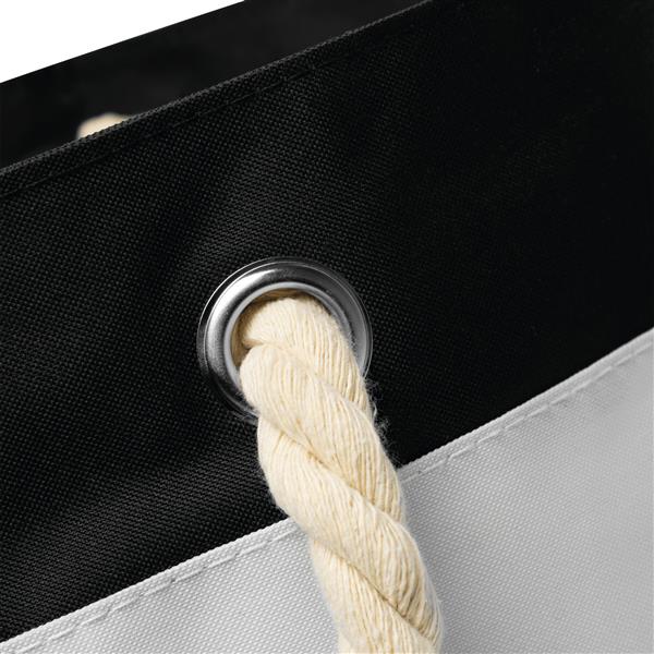 Torba plażowa SYLT w paski w marynistycznym stylu, przestronna komora główna zamykana na rzep, wewnątrz dodatkowa kieszonka na zamek błyskawiczny, 2 sznurkowe uchwyty wykonane z bawełny z metalowymi oczkami. Materiał: 300D Poliester/Bawełna Kolor: biały, czarny Tagi: Artykuły plażowe,torby,shoppery