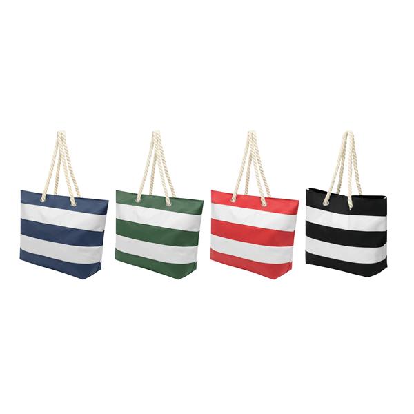 Torba plażowa SYLT w paski w marynistycznym stylu, przestronna komora główna zamykana na rzep, wewnątrz dodatkowa kieszonka na zamek błyskawiczny, 2 sznurkowe uchwyty wykonane z bawełny z metalowymi oczkami.