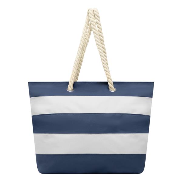 Torba plażowa SYLT w paski w marynistycznym stylu, przestronna komora główna zamykana na rzep, wewnątrz dodatkowa kieszonka na zamek błyskawiczny, 2 sznurkowe uchwyty wykonane z bawełny z metalowymi oczkami.