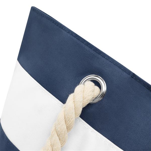 Torba plażowa SYLT w paski w marynistycznym stylu, przestronna komora główna zamykana na rzep, wewnątrz dodatkowa kieszonka na zamek błyskawiczny, 2 sznurkowe uchwyty wykonane z bawełny z metalowymi oczkami. Materiał: 300D Poliester/Bawełna Kolor: biały, niebieski Tagi: Artykuły plażowe,torby,shoppery