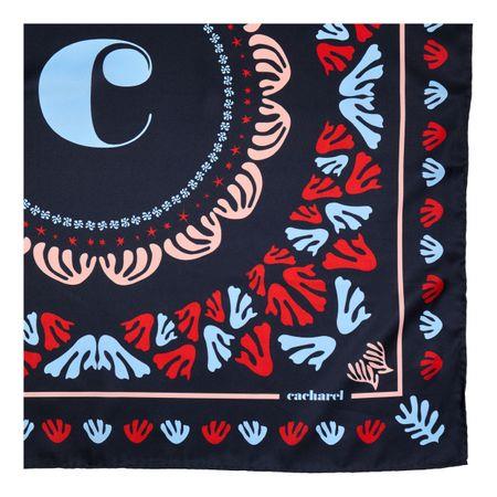Szalik `Vivienne` w kolorze granatowym ma abstrakcyjny wzór inspirowany naturą, z organicznymi kształtami i paletą kolorów, która jest zarówno miękka, jak i odważna. Nowoczesne podejście do DNA marki Cacharel łączy ponadczasową elegancję ze współczesnym kunsztem. Ozdobiony emblematycznym logo `C`, ten szalik o wymiarach 65 x 65 cm dodaje charakterystycznego akcentu każdemu strojowi. Wykonana z wegańskiego jedwabiu (poliester twill).