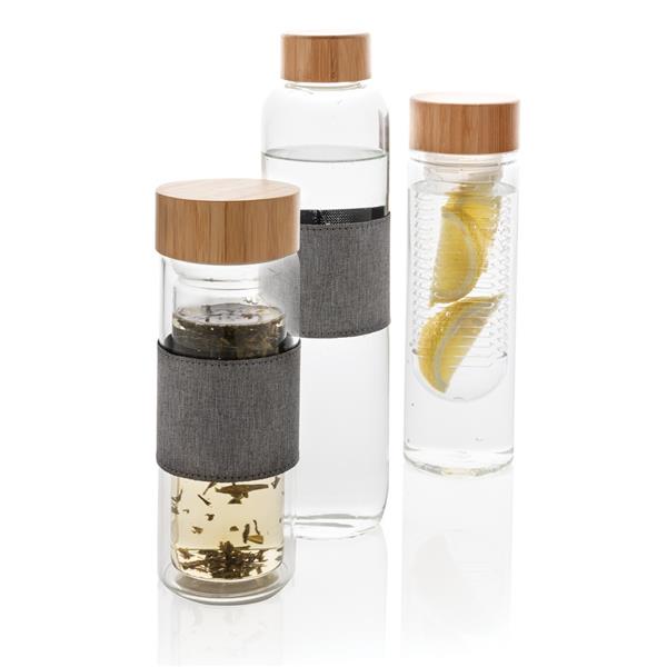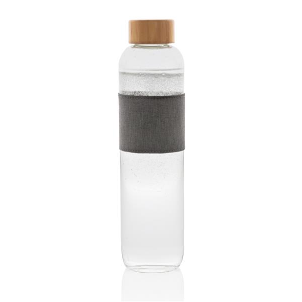 Szklana butelka 750 ml w pokrowcu z RPET, wykonana z wysokiej jakości szkła borokrzemowego odpornego na zmiany temperatury, szczelna zakrętka z bambusa, 2% zysku ze sprzedaży każdego produktu jest przekazywane do fundacji Water.org
