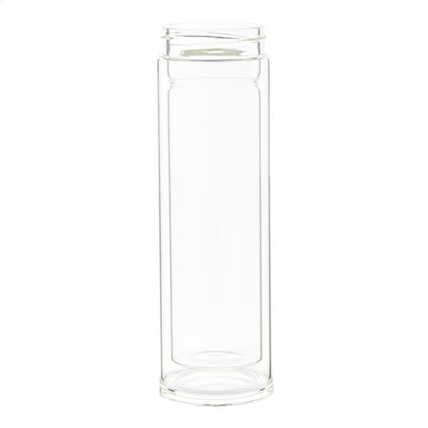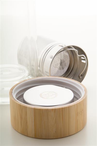 Butelka z podwójnymi ściankami, izolowana ze szkła borokrzemowego, z zaparzaczem i bambusową pokrywką. 420ml.