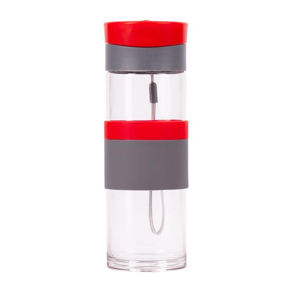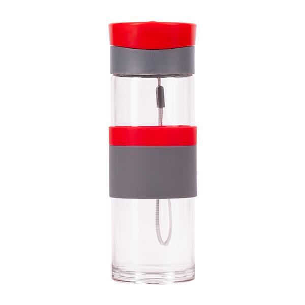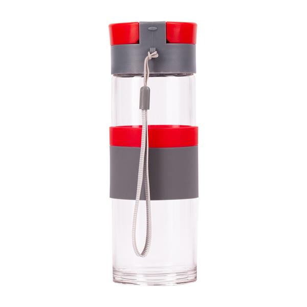 Szczelny bidon o pojemności 440 ml. Wykonany ze specjalnego szkła borokrzemowego, które jest nadzwyczaj przyjazne naszemu zdrowiu, a także lżejsze od tradycyjnego szkła. Bidon wyposażony jest w uchwyt na nadgarstek, opaskę do trzymania oraz szczelne zamknięcie typu leak proof zapobiegające wyciekaniu płynów. Nie zawiera BPA.