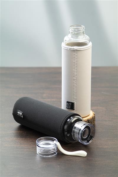 Butelka szklana z recyklingu z wieczkiem z tworzywa sztucznego PS, silikonowym paskiem do noszenia i pokrowcem z neoprenu RPET, 550 ml. Nie nadaje się do napojów gazowanych.