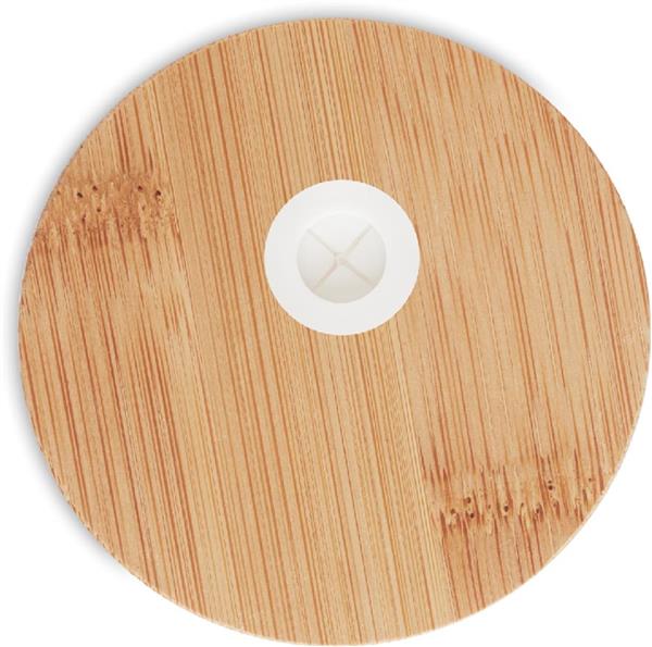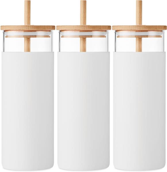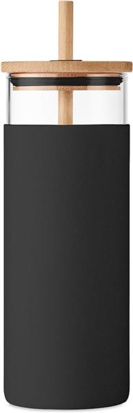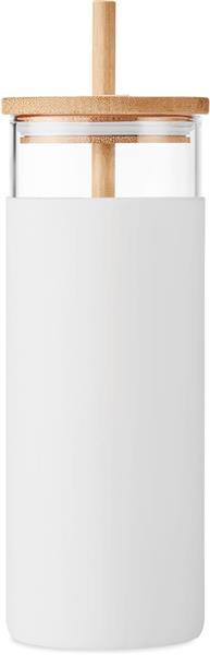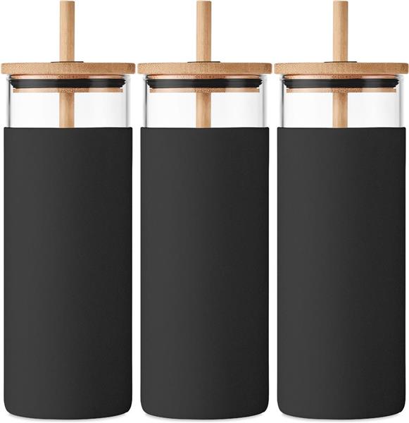 Szklanka z borokrzemianu z silikonową osłoną i bambusową pokrywą i słomką. Pojemność: 450ml. Ponieważ jest to kubek jednościenny, może on przenosić ciepło na zewnątrz. Bambus jest produktem naturalnym, dlatego mogą wystąpić nieznaczne różnice w kolorze, wzorze i rozmiarze.