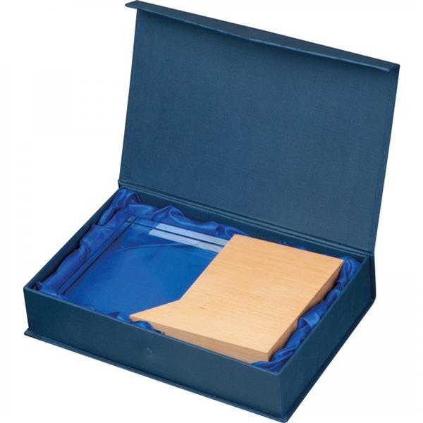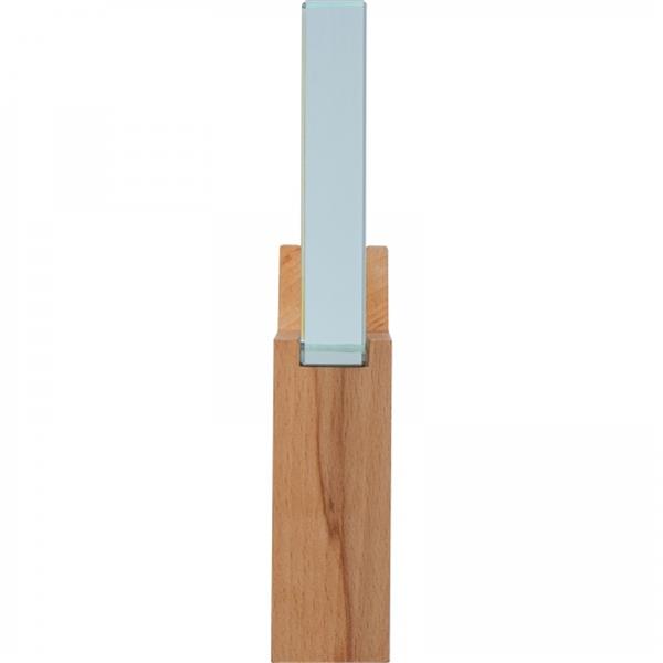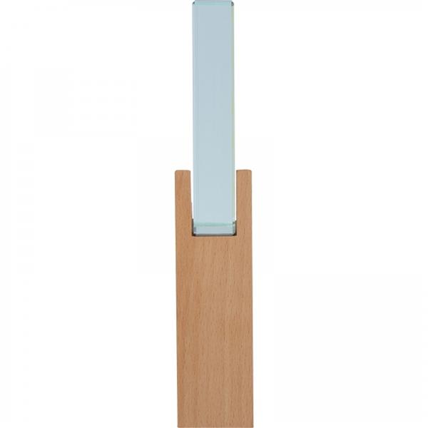 Szklane trofeum na drewnianej podstawie. Dołączone eleganckie pudełko prezentowe. Grubość trofeum: 3,5 cm.