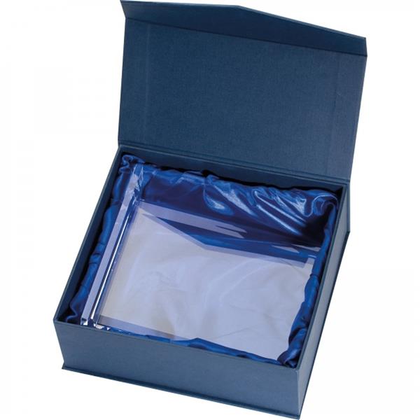 Szklana tabliczka, na której metodą graweru laserowego można umieścić tekst gratulacji lub życzenia. Tabliczka zapakowana w ozdobne pudełko wyściełane satyną.
