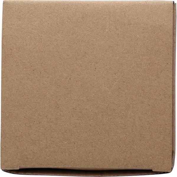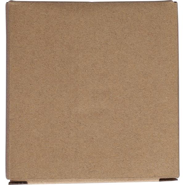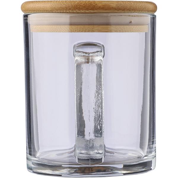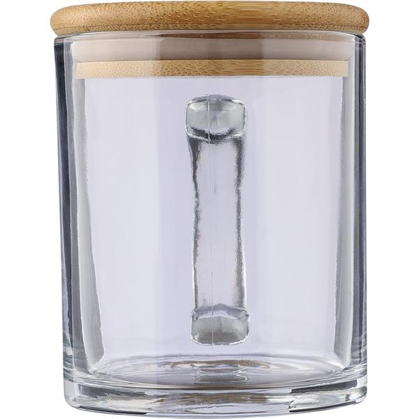 Szklany kubek 300 ml, bambusowa pokrywka, która może służyć jako podstawka, zapakowany w brązowy kartonik, produkt wykonany ze szkła z recyklingu