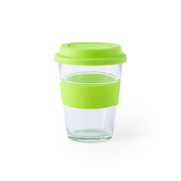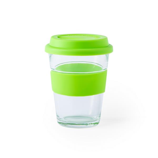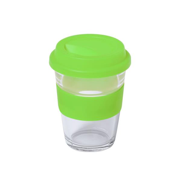 Szklany kubek podróżny 350 ml z kolorową silikonową obręczą i wieczkiem