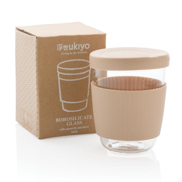 Szklany kubek podróżny Ukiyo 360 ml, wykonany ze szkła borokrzemowego, silikonowy uchwyt, wieczko z otworem zapobiegającym zbieraniu się ciśnienia, ślad węglowy produktu: 0,77 kg CO2