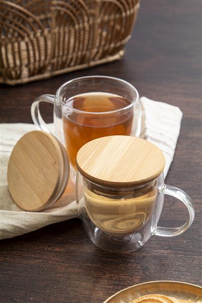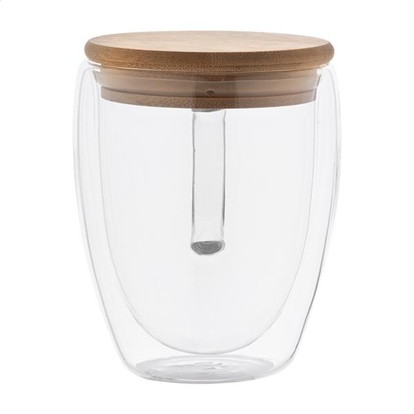 Kubek termiczny z podwójnymi ściankami ze szkła borokrzemowego z uchwytem i bambusową pokrywką, 350 ml. W kartoniku.
