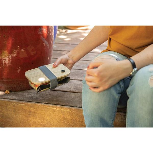 Pojemnik na żywność, wykonany z wysokiej jakości szkła borokrzemowego odpornego na różnice temperatur, szczelne, bambusowe wieczko, łyżkowidelec w komplecie, ślad węglowy produktu: 1,87 kg CO2