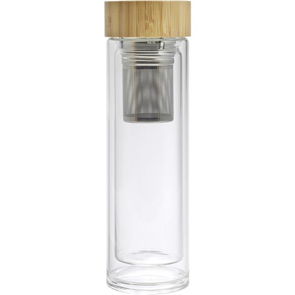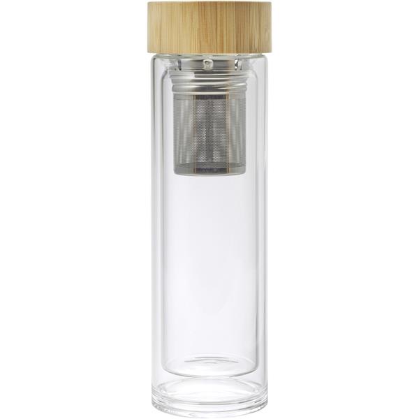 Szklany termos 420 ml, posiada wyjmowane sitko zatrzymujące fusy, bambusowa zakrętka, podwójne ścianki, utrzymuje temperaturę napojów gorących do 4 godzin +leakproof