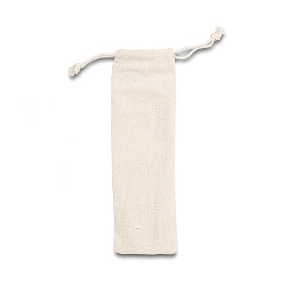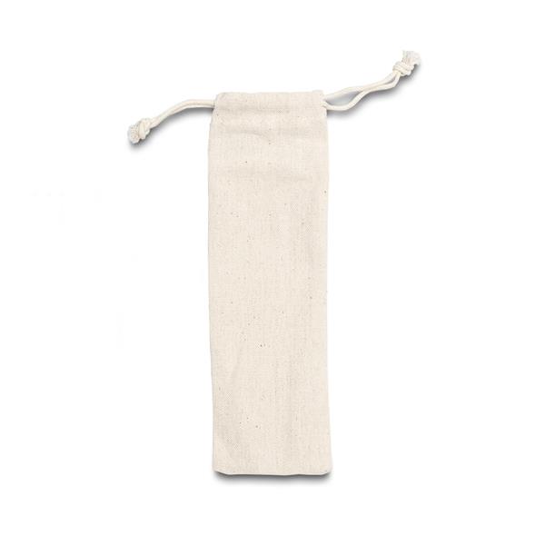 Zestaw sztućców ze stali nierdzewnej, z bambusowymi uchwytami. Pakowane w bawełniany woreczek.