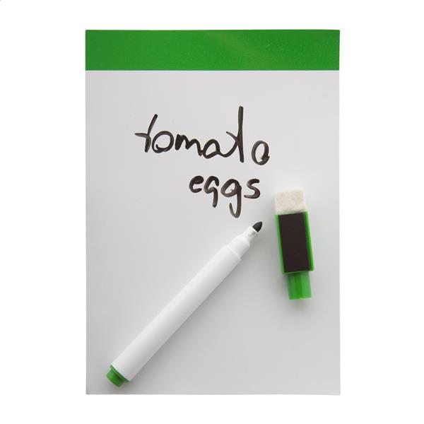 Biała tablica magnetyczna z markerem, gąbką i magnesem.