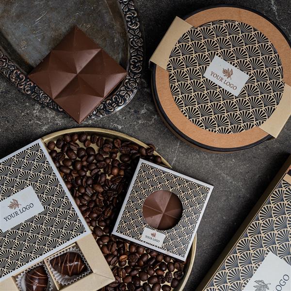 Eleganckie opakowanie nawiązujące wizualnie do wyszukanej stylistyki art deco podkreśla wyjątkowość tej czekolady. Lecz jeśli chcesz, możesz wykorzystać powierzchnię pudełka jako miejsce na reklamę swojej marki i zamieścić dowolną grafikę, hasło lub zdjęcie. Umożliwiamy pełną personalizację opakowania drukiem cyfrowym