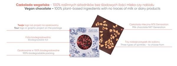W pełni spersonalizuj swoje opakowanie dowolnym zdjęciem lub grafiką z logo! Papier certyfikowany FSC w połączeniu z folią kompostowalną, zabezpieczającą czekoladę, daje całkowicie biodegradowalne opakowanie!