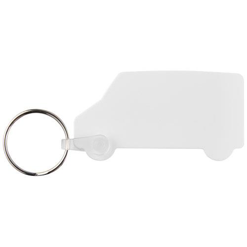 Biały łańcuch do kluczy w kształcie furgonu z metalowym pękiem na klucze. Metalowy pierścień cechuje płaski profil, który idealnie nadaje się do wysyłek.