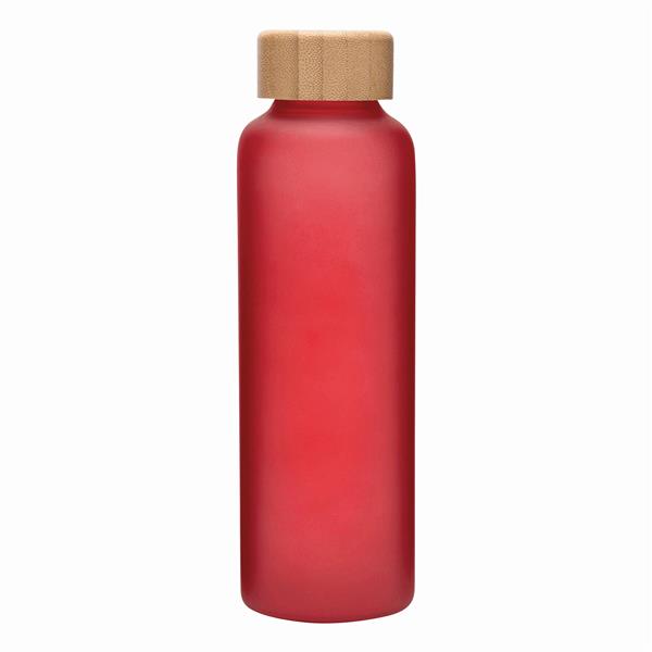 Szklana butelka TAKE FROSTY z bambusową zakrętką. Pojemność ok. 500 ml. Materiał: Szkło/Bambus/Silikon Kolor: czerwony Tagi: Butelki do napojów,artykuły sportowe,fitness,artykuły rekreacyjne,akcesoria podróżne,butelki szklane
