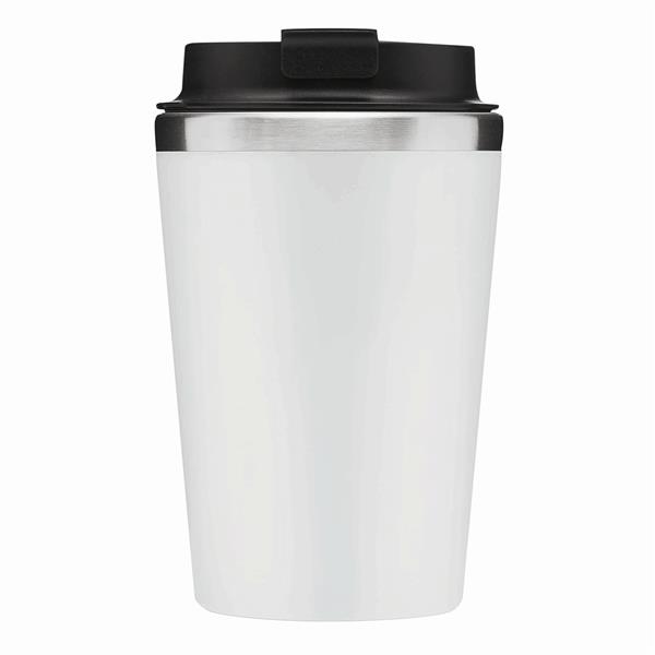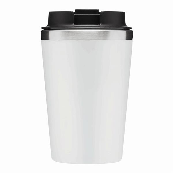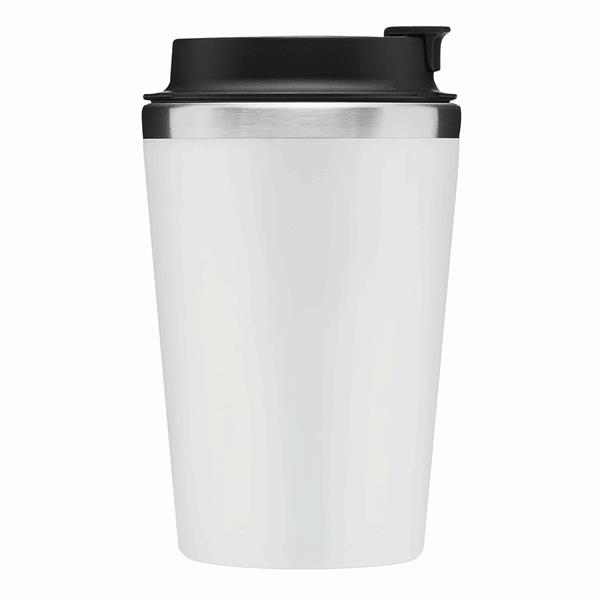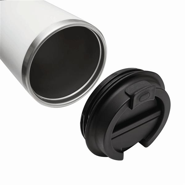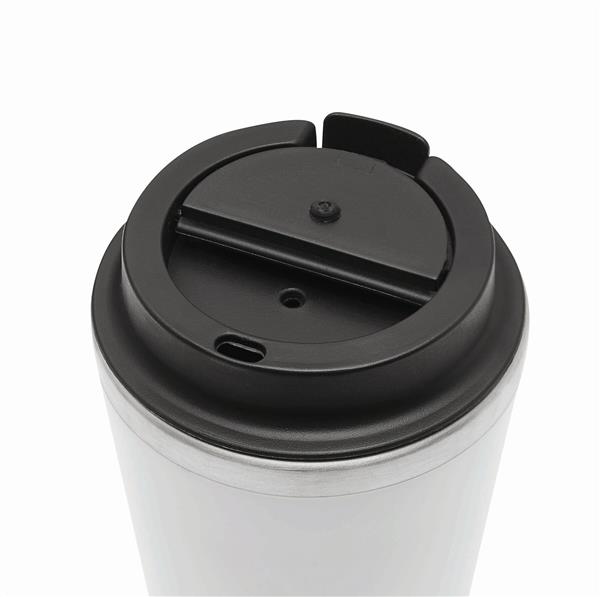 Kubek podróżny TAKE & GO dwuścienny: wykonany ze stali nierdzewnej wewnątrz i tworzywa sztucznego na zewnątrz, bezpiecznie zakręcana plastikowa pokrywka ze zintegrowanym otworem do picia i silikonową uszczelką, pojemność ok. 350 ml, utrzymuje ciepło napojów przez ok. 2 godziny i zimne do 4 godzin.