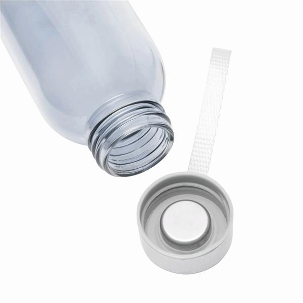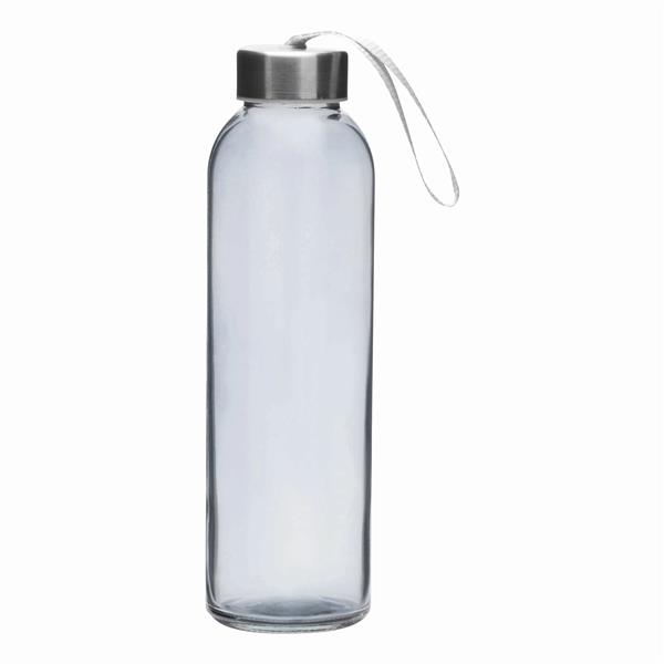 Butelka szklana TAKE SMART. Zakrętka ze stali nierdzewnej z uszczelką silikonową i smyczą. Pojemność ok. 500 ml, w białym pudełku.